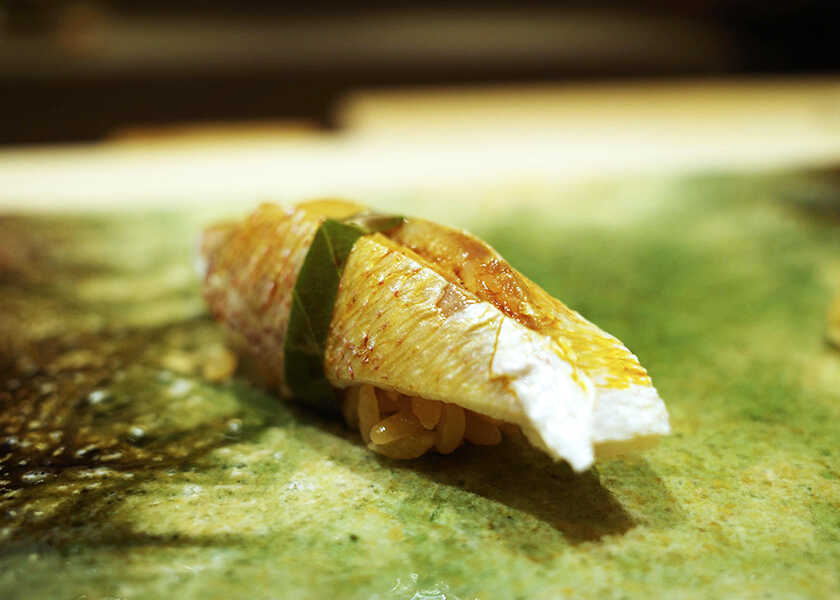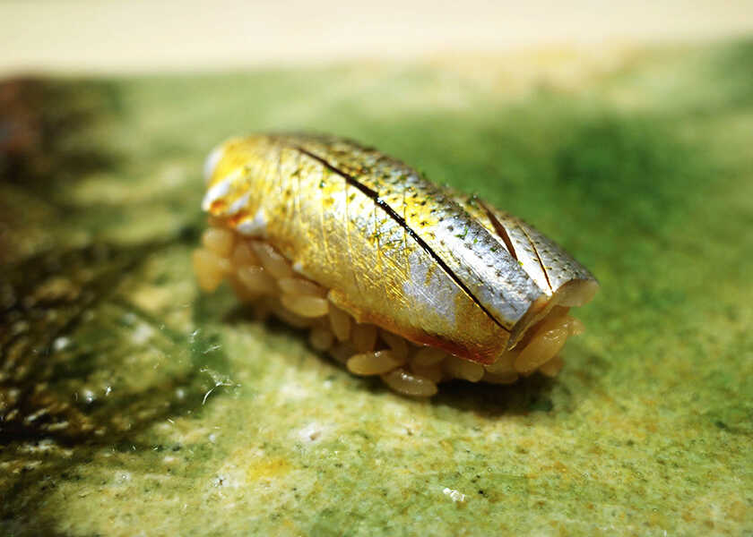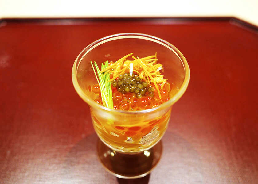 イクラ新子は大きくなったので1枚で握り、昆布〆めに。イクラはグラスで提供され、キャビア、芽ネギ、素揚げしたエシャロットと合わせた。瞬間燻製して、魚卵に相性のいい燻香を添えた。
