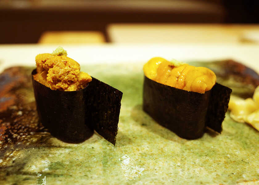 左:バフンウニ 右:ムラサキウニ天然のバフンウニは、北海道にある〈小川商店〉の“おがわの生うに”で、とてもクリーミーな味わい。オプションで〈村上商店〉のミョウバン不使用“むらかみのうに”のムラサキウニも追加注文可能(ランチ2000円、ディナー3000円~)。雲丹を食べ比べできるのは貴重な体験なので、興味があれば試してみて。