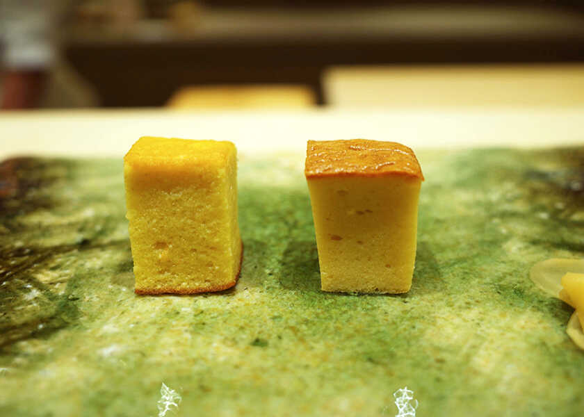 左:〈新宿なだ万〉の玉子 右:〈鮨 銀座おのでら〉の玉子玉子は2種類。左が〈新宿なだ万〉の白身魚を加えたスフレ風で、右がじっくりと火入れした〈鮨 銀座おのでら〉のカステラ風。どちらの玉子が好みかで話も盛り上がりそう!