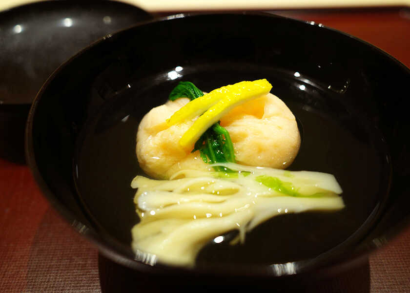 吸物 生海苔仕立て 海老真丈 白舞茸 青味 柚子
