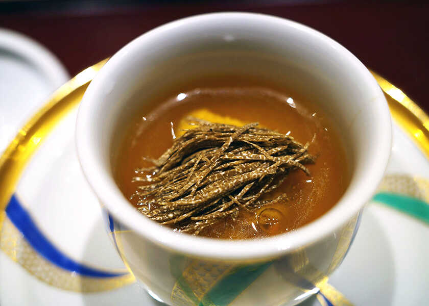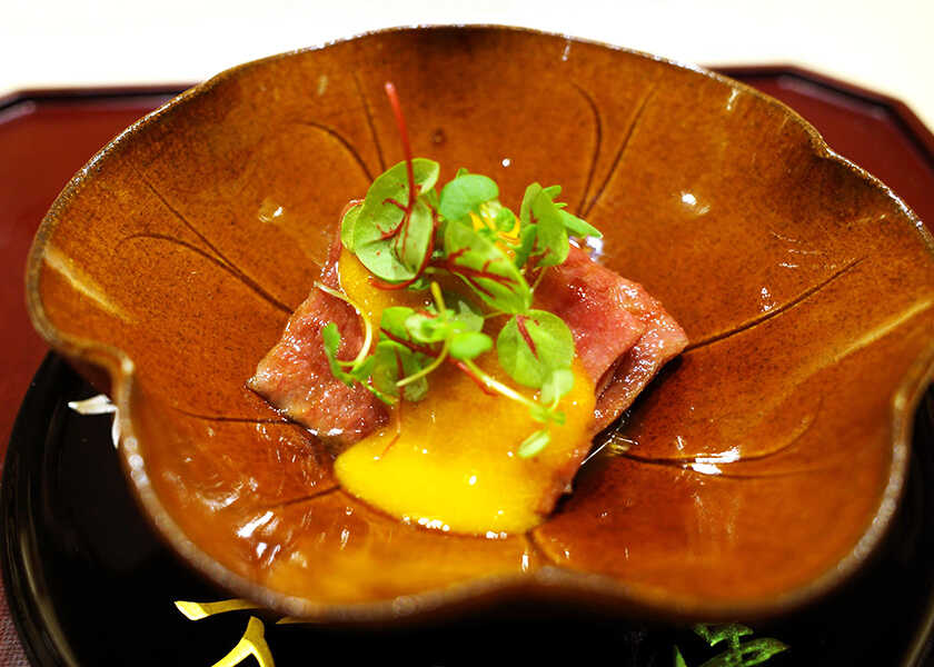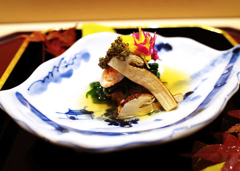温物の“生雲丹茶碗蒸し トリュフ餡”は、雲丹とトリュフが好きという岩永さんのスペシャリテ。濃厚な生雲丹と旨味たっぷりの茶碗蒸しが最高のコンビネーション。トッピングされたオータムトリュフの細切りが素晴らしい幽香を放つ。瀬戸焼の磁器に施されたゴールドが、餡の輝きに調和する。