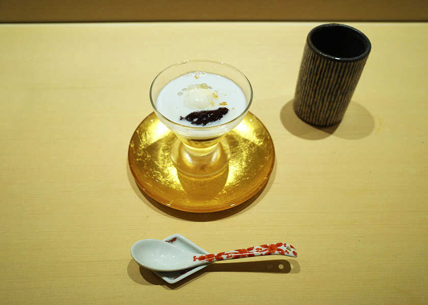 “なだ万名物 グラマラッカ タピオカ ココナッツミルク 小豆 バニラアイス 黒蜜”最後のデザートもチョイスできるのが嬉しい悩み。“なだ万名物 グラマラッカ タピオカ ココナッツミルク 小豆 バニラアイス 黒蜜”は1991年から提供されている定番甘味。ココナッツミルクの優しい甘味と、粒餡のしっかりとした甘味がよいコントラスト。バニラアイスがクリーミーで、タピオカのもちもち感が癖になる。