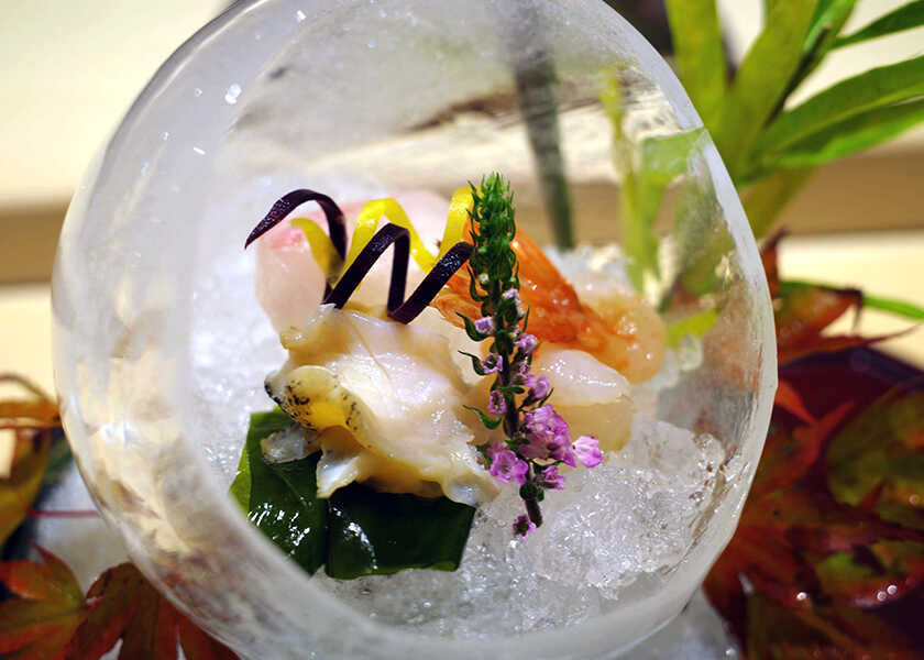 “鯛 つぶ貝 牡丹海老 あしらい 土佐醬油”は、風船氷=氷の丸い器で供された、アーティスティックなお造り。コリコリっとした磯の香りが豊かなつぶ貝、甘くてとろっとした牡丹海老は、ともに北海道産。鹿児島産の鯛は適度に脂が乗っていて、その上味を堪能できる。