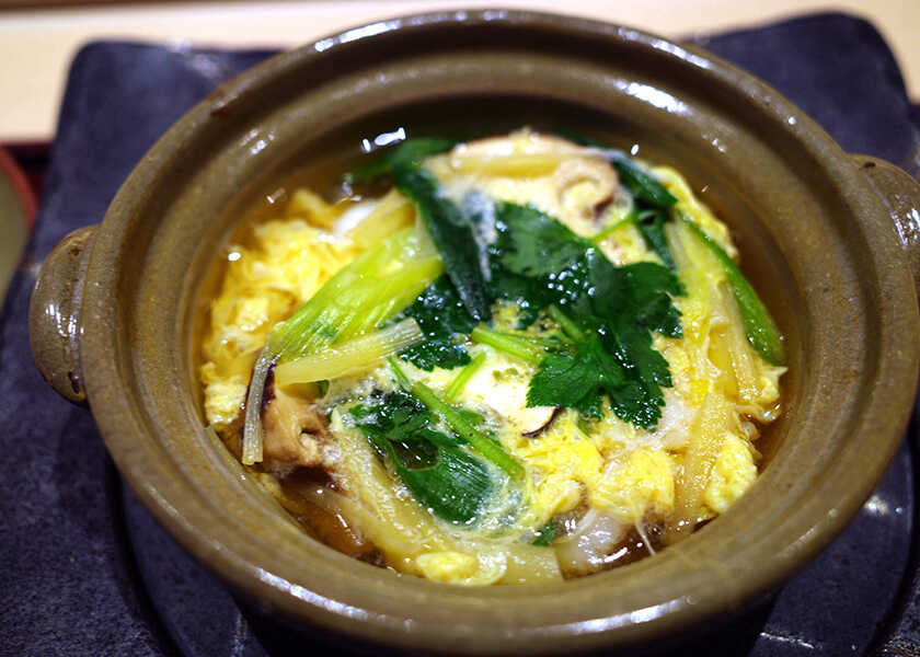 煮物は小鍋が人気。“小鍋仕立て 鱧 松茸玉〆 九条葱 黄菲 粉山椒”は、鰹出汁と鱧の骨を焼いた出汁で作った旨味のあるスープが出色。“玉〆”して優美な味わいに。食味に優れた鱧は、松茸の香り、九条葱のシャキシャキ感、黄韮の快味が合わさって、より奥行きのある風味となっている。