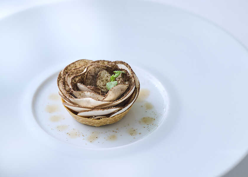 最初の“アミューズ ブーシュ”はブラウンマッシュルームを用いた、とても愛らしい一品。生のブラウンマッシュルームをスライスして薔薇のようにあしらい、ホワイトマッシュルームのパウダーやドレッシングを合わせた。マッシュルームがまとう豊かな土の香りが広がり、その滋味を味わえる。