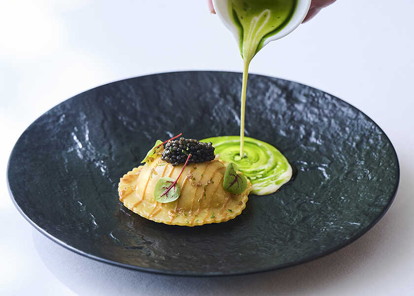 “ラングスティーヌと白いんげん豆のラヴィオリ ソースノイリー カルヴィシウス社のオシェトラ キャヴィア添え”