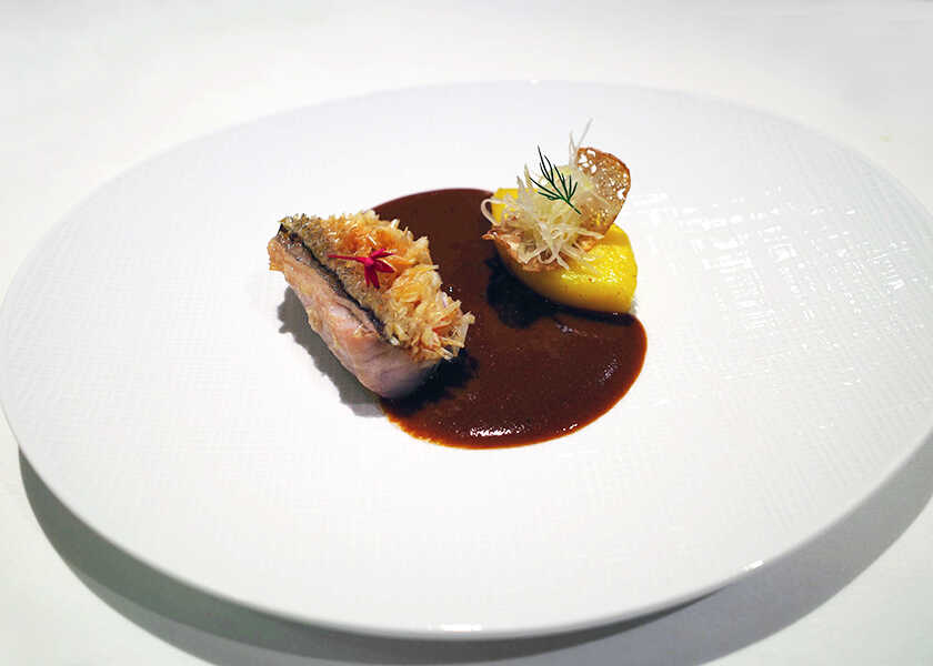 魚料理は“甘鯛のクルスティアン スープ ド ポワソン サフラン風味のジャガイモのカリソン”。食味に優れた甘鯛は、皮目をパリッとした鱗焼きにし、身は上味に仕上げた。上に乗せられたフヌイユ=フェンネルはハーバルなアクセント。魚と甲殻類のスープ ド ポワソンは旨味に富んでいる。アーモンドの形をしたサフラン風味のジャガイモは、甘味があって乙な味わい。