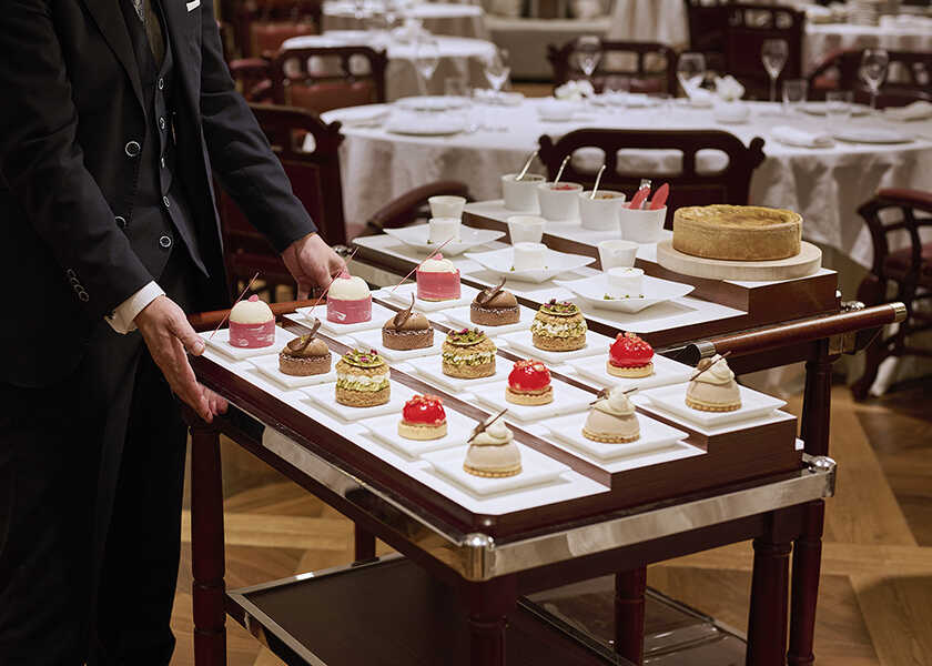 デザートの“ワゴンに並ぶ至高のデセールコレクション”は、本店のクオリティとボリュームにならった“至福のデザートタイム”。約7種類の珠玉のデザートを好きなだけチョイスできる。チョコレートタルトはオレンジのソースを包んでさっぱりとしていて、パリブレストはピスタチオの香りが実に豊か。モンブランは和栗とイタリア栗を適材適所に用いており、バーナーで仕上げるスペシャリテのウフ・ア・ラ・ネージュはアングレーズソースとの相性が抜群。