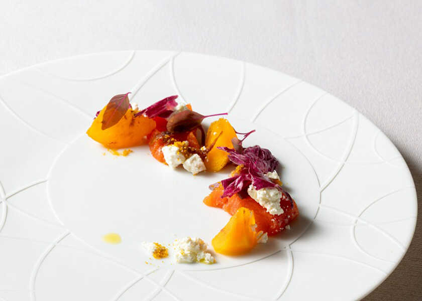 オードブルは秋らしいプレゼンテーションの“みやぎサーモンのミキュイと柿のマリネ リコッタチーズに奈良漬のアクセント”。生でも美味な「みやぎサーモン」にレモンの香りを纏わせ、ほんのわずかに火入れすることで旨味を高めてある。