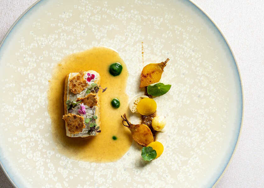 コースより“香ばしく焼き上げた太刀魚ときのこ入り帆立貝ムース 黄色いビーツのピクルスにアーモンドと焦がしバターの香り”