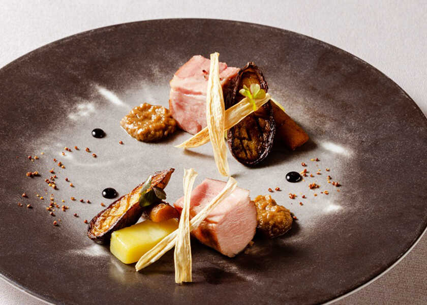 コースより“備長炭で炙った金華豚と秋茄子のソース 甘酸っぱい紅はるかとごぼう”