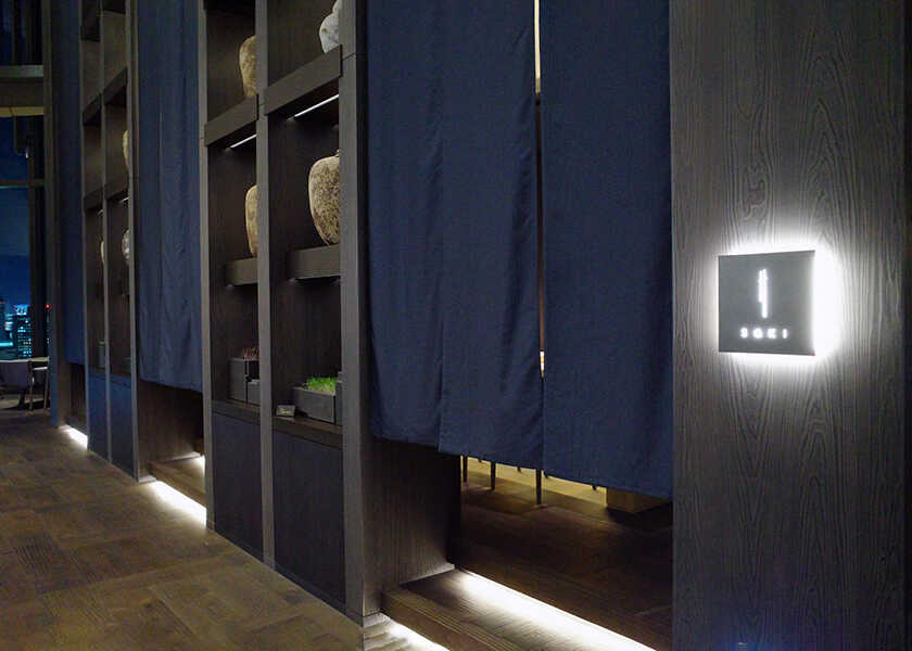 ホテルレストランのなかでもイチオシなのが、わずか8席のカウンターで体験できる割烹料理〈咲(Saki)〉。約9mもの天井高と長い暖簾が印象的で、圧倒的な開放感を誇る。すべての席が東京湾を望むベイビューに面し、レインボーブリッジなどのきらめく絶景を眺められるというロケーションだ。