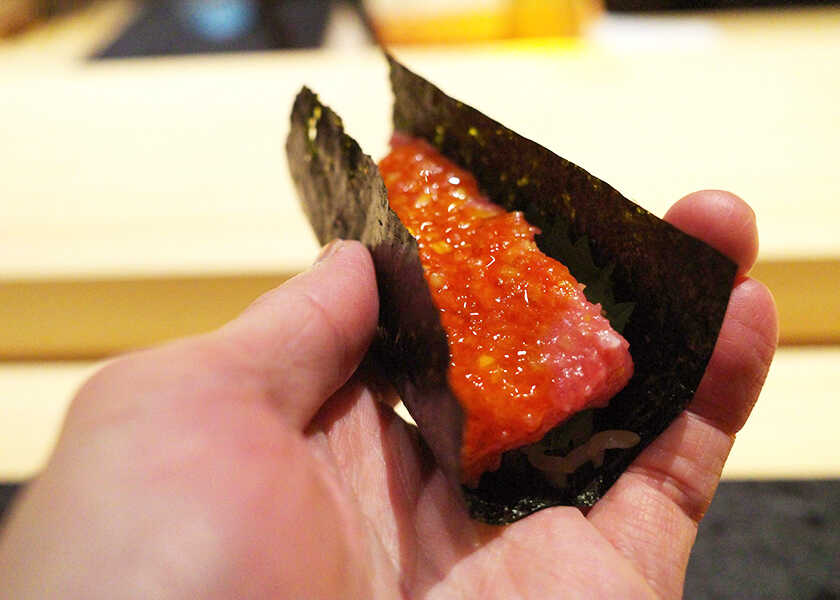 定番の一品が、“シグネチャー 中トロと大トロの手巻き 麻辣仕立て 焙煎花椒 酢漬け大根 白ネギ 大葉”。中トロと大トロの叩きに、麻辣の醤油とオイルを合わせ、ちょっぴり刺激的な食味に紡いだ。焙煎した花椒の華やかな香り、酢漬け大根の酸とシャキシャキ感、白ネギと大葉の風味は、とても脇役とは思えない存在感がある。