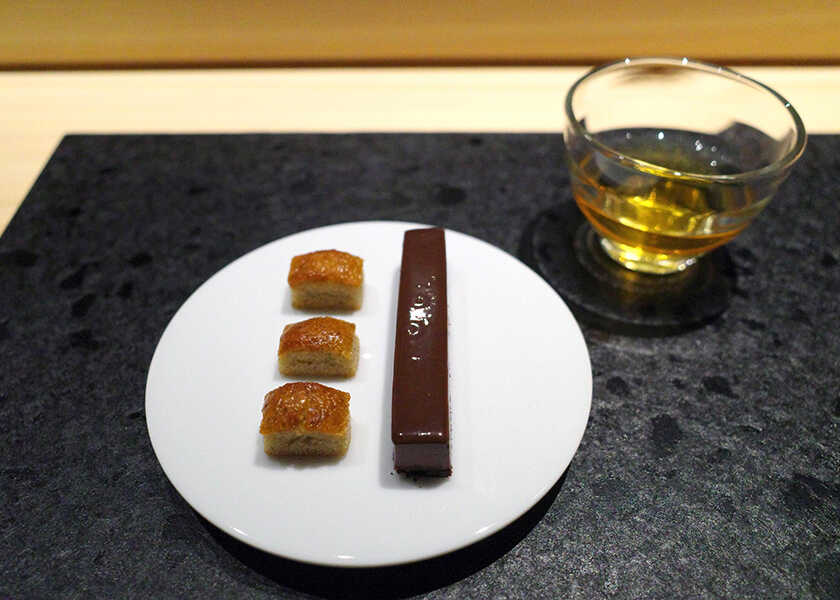 最後の小菓子は、“焦がしバター香る 柚子のフィナンシェ ヴァローナ社 グアナハのガナッシュ”。柚子のフィナンシェは幽香が素晴らしく、一口サイズで提供されているので食べやすい。ヴァローナ社 グアナハのガナッシュは口溶け感があり、心地よいビター感で締められる。