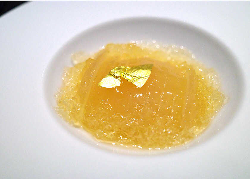 デザートの“和梨のポーチ 味醂 梅干”は、和梨のコンポートに、梅干しとみりんのジュレという優しい取り合わせ。金粉のあしらいで華やか。