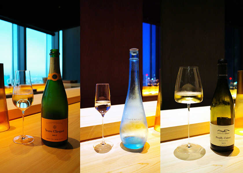 左:“ヴーヴ・クリコ イエローラベル ブリュット” 中:“HEAVEN SAKE 純米吟醸 アズール レジス・カミュ×七賢” 右:“ドメーヌ・ジル・モラ プイィ・フュイッセ ベレムナイト 2023”