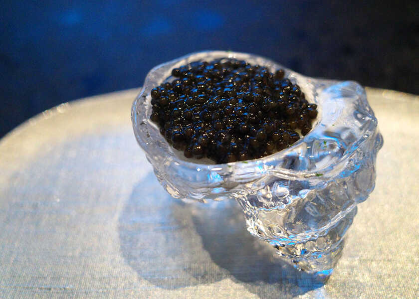 “白エビの昆布締め オセトラキャビア”は、北海道羅臼の昆布で白海老を締めて味わいを深めた。惜しげもなくオシェトラキャビアをのせて、ちょうどいい塩味に。酢橘の香りが爽やか。