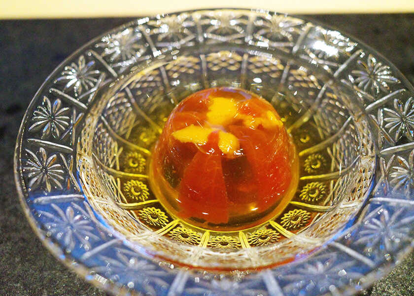 フランス料理のテリーヌをイメージしたのが、クローシュをかぶせて提供される“浜中バフンウニとホッキ貝ともずく アメーラトマトのアスピック”。高糖度のアメーラトマト、佳味をたずさえたバフンウニ、食感の変化を与えるオクラをゼリー寄せに仕上げた。甘味と酸味、旨味が渾然一体となっているのが特長。酢の効いた出汁がかけられているので、合わせて食べるとより風味が広がる。