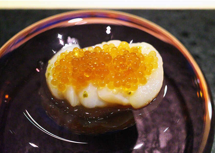 “北海道ホタテ柚子胡椒添え”は、甘い北海道のホタテの上に、オレンジ果汁でマリネした紫蘇ジュースのキャビアがふんだんに乗せられている。柚子胡椒がしっかりとしたアクセントで、菅原工芸硝子のグラス器がスタイリッシュ。