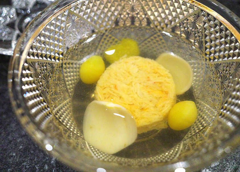 “北海道毛蟹のクラブケーキ スープ仕立て 銀杏とゆり根”