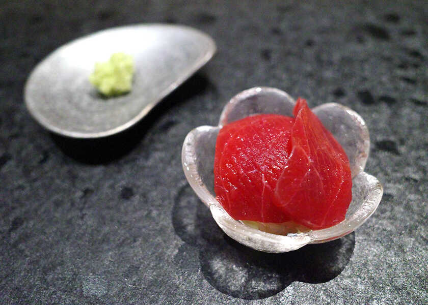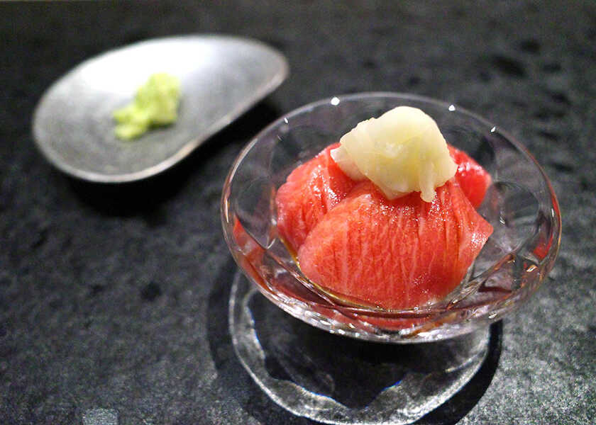 天然の生鮪にこだわり、バカラのグラス器に盛られたのが、“アイルランド沖鮪の二種丼 赤身を玄米茶香る白醤油で 中トロをべったら漬けと共に”。赤身と中トロを小丼にして順番に提供した。赤身は玄米茶に3日間漬けた白醤油と合わせて、慎ましやかな快味が広がる。脂が乗った中トロには、東京発祥の甘口のべったら漬けを乗せて、より脂の香りが引き立つように。赤シャリは酸味をややしっかりめに、煮切は少し甘めに仕上げ、メリハリを付けているので飽きさせない。
