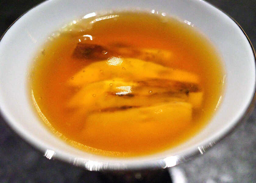 “松茸の茶碗蒸し ロワイヤル”は、バターでローストした松茸を茶碗蒸しに包み込んだ。醤油のべっこう餡はトロリとしてコクがある。バターの風味が茶碗蒸しにはない香気で、新しい感覚。