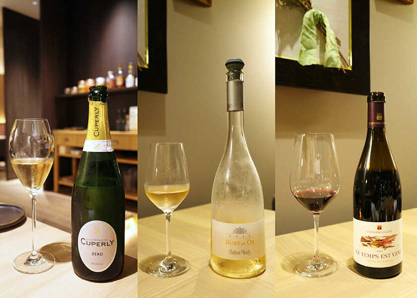 左:“シャンパーニュ・キュペルリー ゼロ・レゼルヴ” 中:“シャトー・ミニュティ ロゼ・エ・オール 2023” 右:“ステファン・オジェ ル・タン・エ・ヴニュ ルージュ 2022”