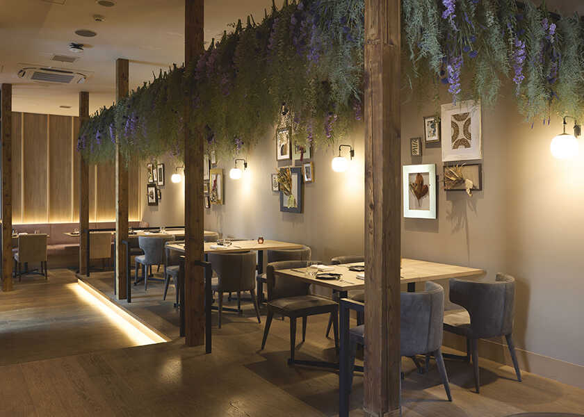 店内には32席が設けられていて、スペーシャスな臨場感あふれる空間。クロスを敷かないテーブルやウッディな内観、草花の装いで、肩肘張らず、和やかな雰囲気が紡がれている。