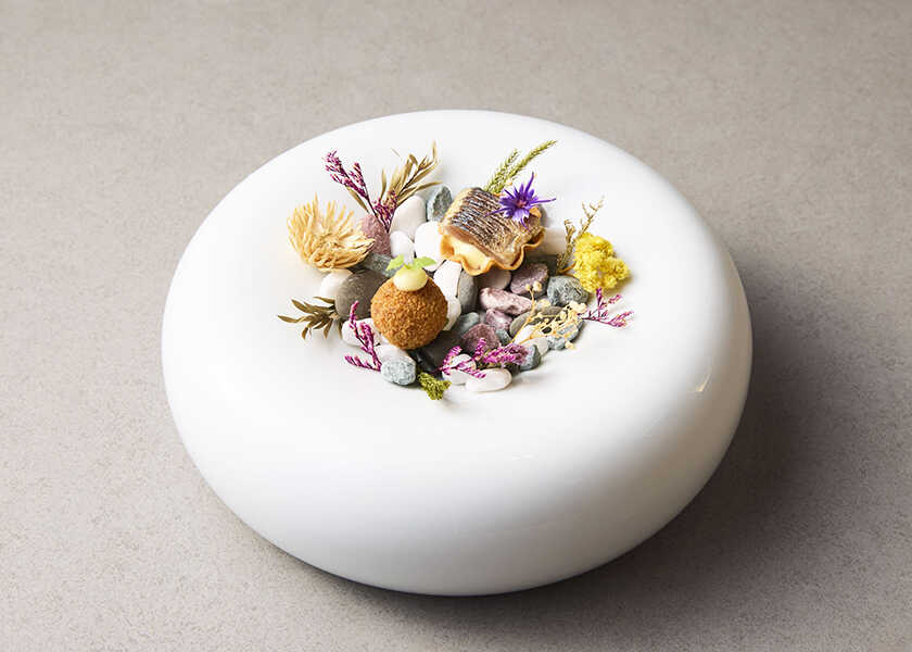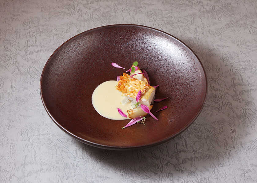 “甘鯛 / 菊 / ヴァンジョーヌ”は、カリカリの鱗焼きにした甘鯛が主役。蕪のフォンダンはやわらかくて、慎ましやかな甘味をもつ。散りばめられた菊の花がとっても可憐。