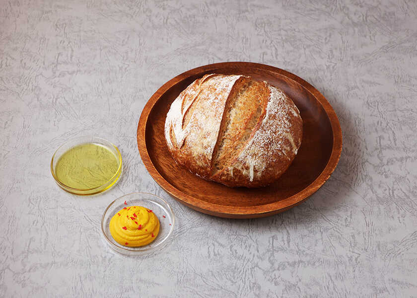 “キタノカオリ / オリーブオイル / サステナブルな野菜のペースト”は、自家製カンパーニュと契約農家から届く規格外の野菜を用いたサステナブルな野菜のペーストの取り合わせ。自家製カンパーニュは、宗定さんがブーランジェの奥さんに相談して創りあげた。品質に定評のある北海道小麦“キタノカオリ”を用いており、クラストがパリッとして、食事に寄り添う。規格外のニンジンを用いたペーストがサステナブルで、ピンクペッパーがピリっとしたアクセント。