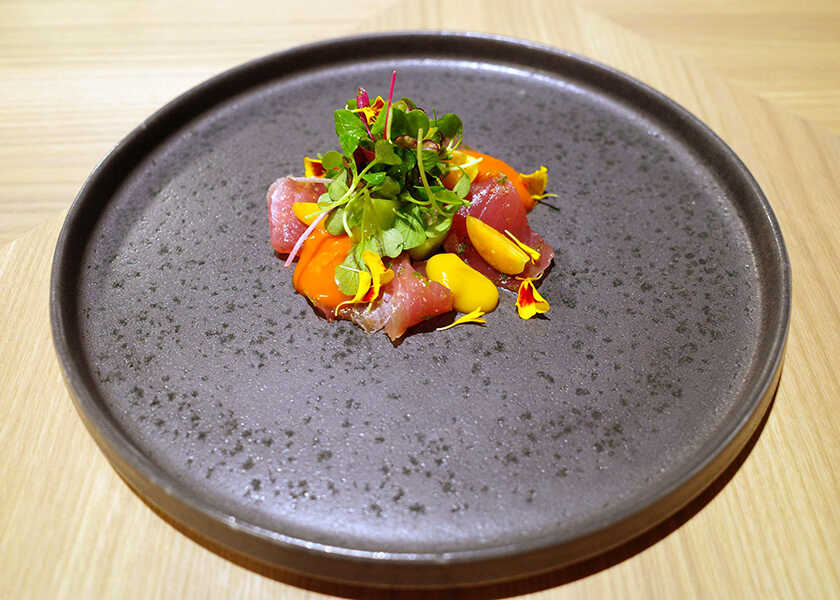 瞬間燻製を効果的に用いたのが、“高知県産戻りガツオ / 発酵パプリカ / ぶしゅかん”。脂が乗った戻り鰹を桜のチップで瞬間燻製して、力強い風味をもたらした。宗定さんの故郷、岡山県のパプリカ2種類を用いたソースは滋味にあふれる。オクラやレッドソレルなど、野菜もたっぷり。