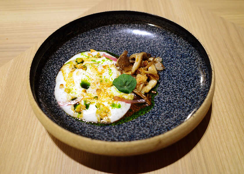 “発酵舞茸 / じゃがいも / 卵黄”は、発酵させて快味を深めた舞茸のソテーに、ジャガイモのエスプーマと卵黄のコンフィを合わせたという意欲作だ。フォンドボーのソースは力強くて旨味抜群。パセリのオイルの彩り、赤玉ねぎのピクルスも印象に残る。ナスタチウムの葉がアイコニック。