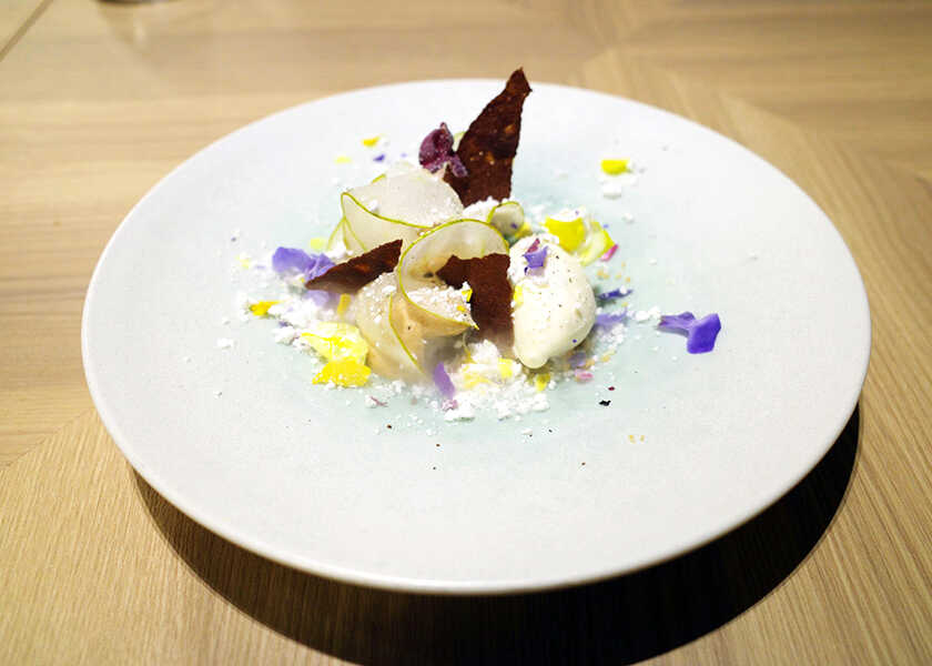 “洋梨 / 落花生 / カカオ”は、仕上げに液体窒素でパウダーにしたエルダーフラワーのソースと色鮮やかな岡山県のエディブルフラワーをかけてもらえる。洋梨のコンポートとバニラアイスでさっぱりとさせ、落花生のクリームはうっとりとするような甘い香り。