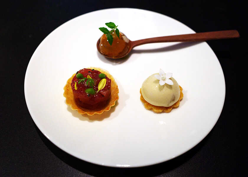 “季節のアミューズブーシュ”では、3品を同時に提供。右が白いペンタスの花を乗せたオニオンムース、奥がチキンコンソメのゼリー、左がマグロのタルタルや菊の花びら。この順番に食べ進めると、だんだん味が濃厚になっていくので食べやすい。