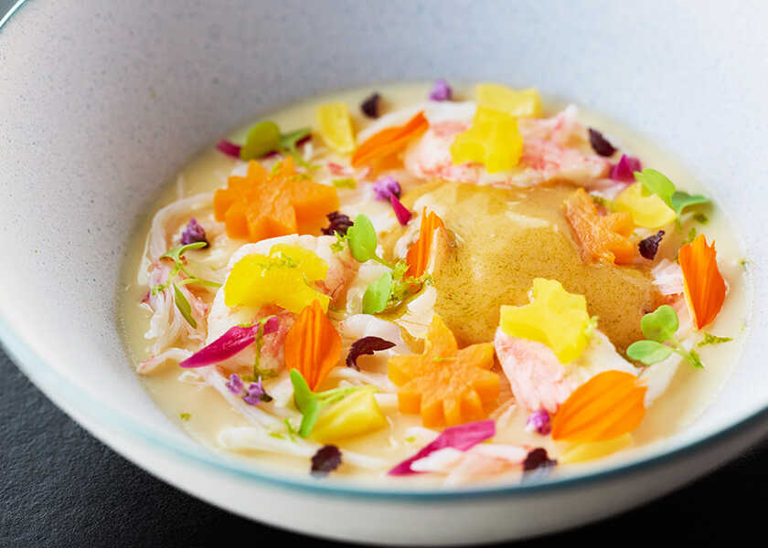 ヨハンさんのシグネチャーのひとつが、茶碗蒸しから着想を得たという“毛蟹 北海道産”。フレンチの技法で、鰹出汁とチキンコンソメを合わせた冷製“茶碗蒸し”を紡いだ。毛蟹と京人参が主張し、上にはレッドソレルなどのスプラウトがたっぷりとあしらわれている。仕上げにかけられた海老の頭などを用いたアメリケーヌソースが白眉。