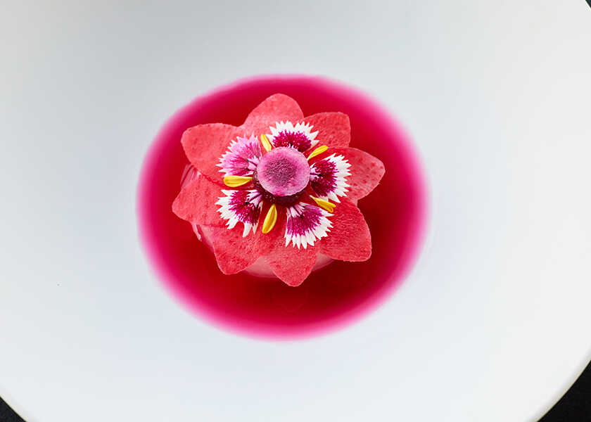 “紅根菜”は、ヨハンさんが日本の“おでん”からインスピレーションを得たという一皿で、花びらのようで美しいプレゼンテーション。箸とスプーンが添えられるので、“おでん感覚”でいただける。大根の代わりに使われた冬瓜、ライスビネガーでピクルスにしたビーツを味わってみて。