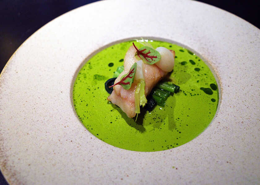魚料理は“ハタ 愛媛県産”。食味に優れた愛媛県のハタをじっくりと低温で火入れし、その佳味を閉じ込めた。蕪は艷やかでバターの香りがいい。上にはレッドソレルが乗せられ、下には小松菜のソテーが敷かれている。仕上げにかけられたクリーミーなクレソンのソースが全ての食材を繋ぐ。
