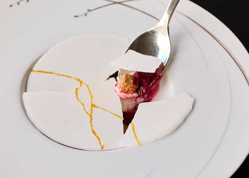 デザートの“金継ぎ 山梨県産”は、まるで何も乗せられていないかのような、金継ぎした器をイメージ。ホワイトチョコレートを割ると、優しい味わいの梨の赤ワイン煮と爽やかなラ・フランスのソルベが登場する。甘味と酸味のバランスが心地よく、散りばめられたクランブルもいい食感。