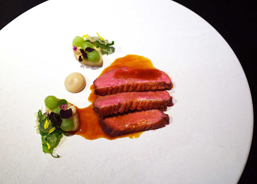 “鴨胸肉 青森県産”がメインディッシュ。鴨胸肉を皮目をクリスピーに焼き上げ、身は繊細にしっとりと火入れ。根セロリのムースリーヌは香り高く、球状にくり抜いた胡瓜のマリネが心地よい酸味。紫蘇の天麩羅が、フレッシュな青い味わいをもたらしてくれる。