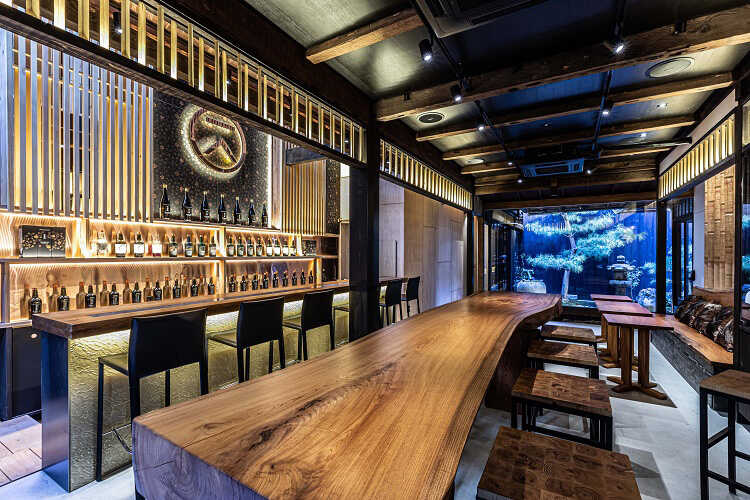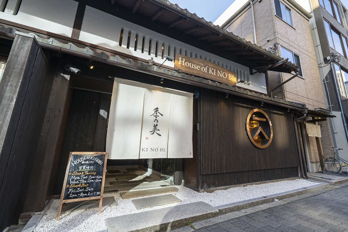 ここは、京都蒸溜所が手がける〈季の美 京都ドライジン〉のブランドホーム。元々は材木商であった歴史ある建造物で、土壁や梁、石畳などはできる限り温存してある。壁紙に江戸時代から続く唐紙屋を継承する〈雲母唐長(KIRA KARACHO)〉の唐紙が使われるなどインテリアは京都の職人とコラボレーション。店内では京都の工芸品や器も使われ、販売もされている。