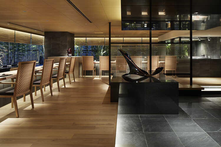 アペリティフを味わった後はディナーへと。場所は京都駅から徒歩2分という好立地にある、ラグジュアリーホテル〈ザ・サウザンド京都〉内にある日本料理〈キザハシ〉。