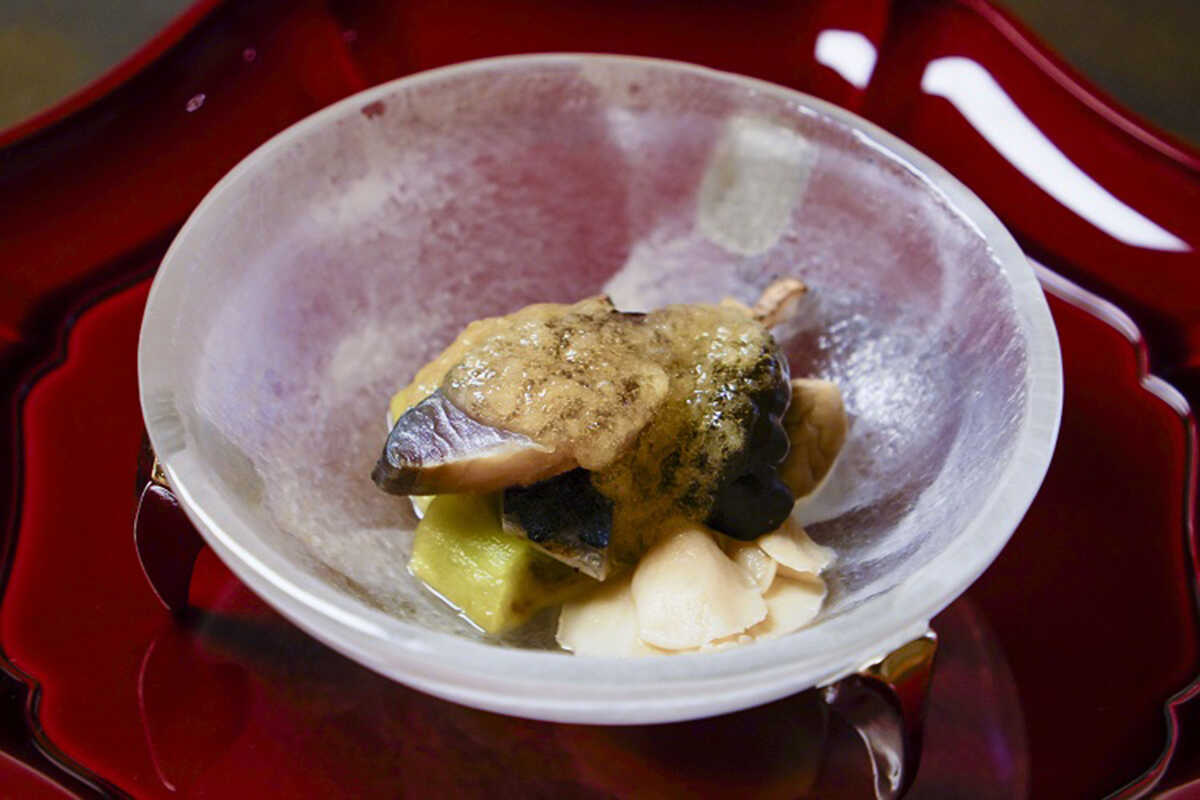 “HANA 華”より、“先付”(炙り鯖、翡翠茄子、大黒占地、白舞茸、林檎ジュレ)