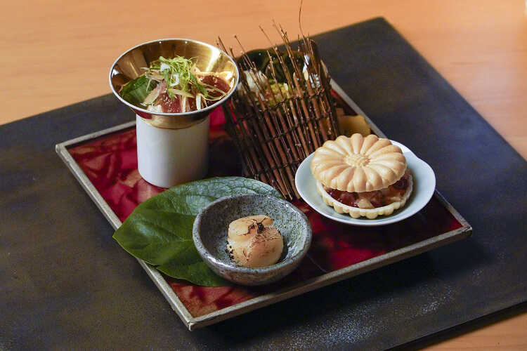 “HANA 華”より、“八寸”(帆立手毬寿司、キャビア、花びら茸、菊花、お浸し、雲子、しろ菜、ポン酢ジュレ、燻製サーモン、筋子)
