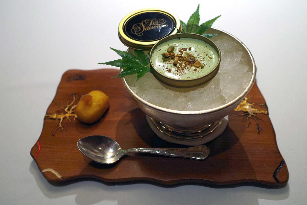 “アミューズ”は定番の一品。店名が蓋に刻印されたキャビアの缶がアイコニック。缶の中には、タルタルにした富士山麓のマスが敷かれており、その上には、ピスタチオとそのクリーム。ふわふわに揚げたカボチャのニョッキは、そのまま食べてもOK。