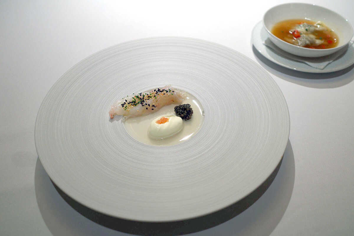 ・ラングスティーヌをシトロンキャヴィアで飾って エスプレットスープのラビオリと一緒に