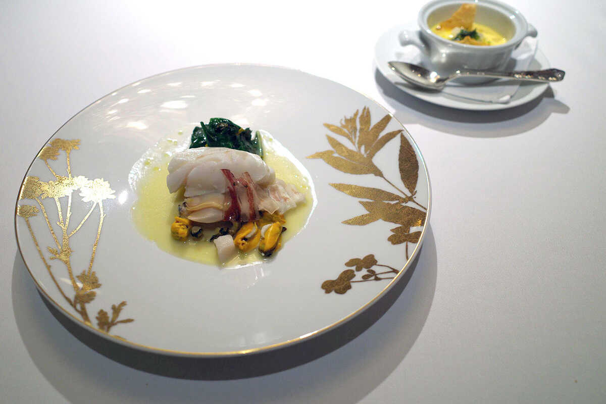 ヨーロッパ産平目と様々な貝をシャンパンで仕上げたソースと共に 軽く火を入れたハーブ類を添えて