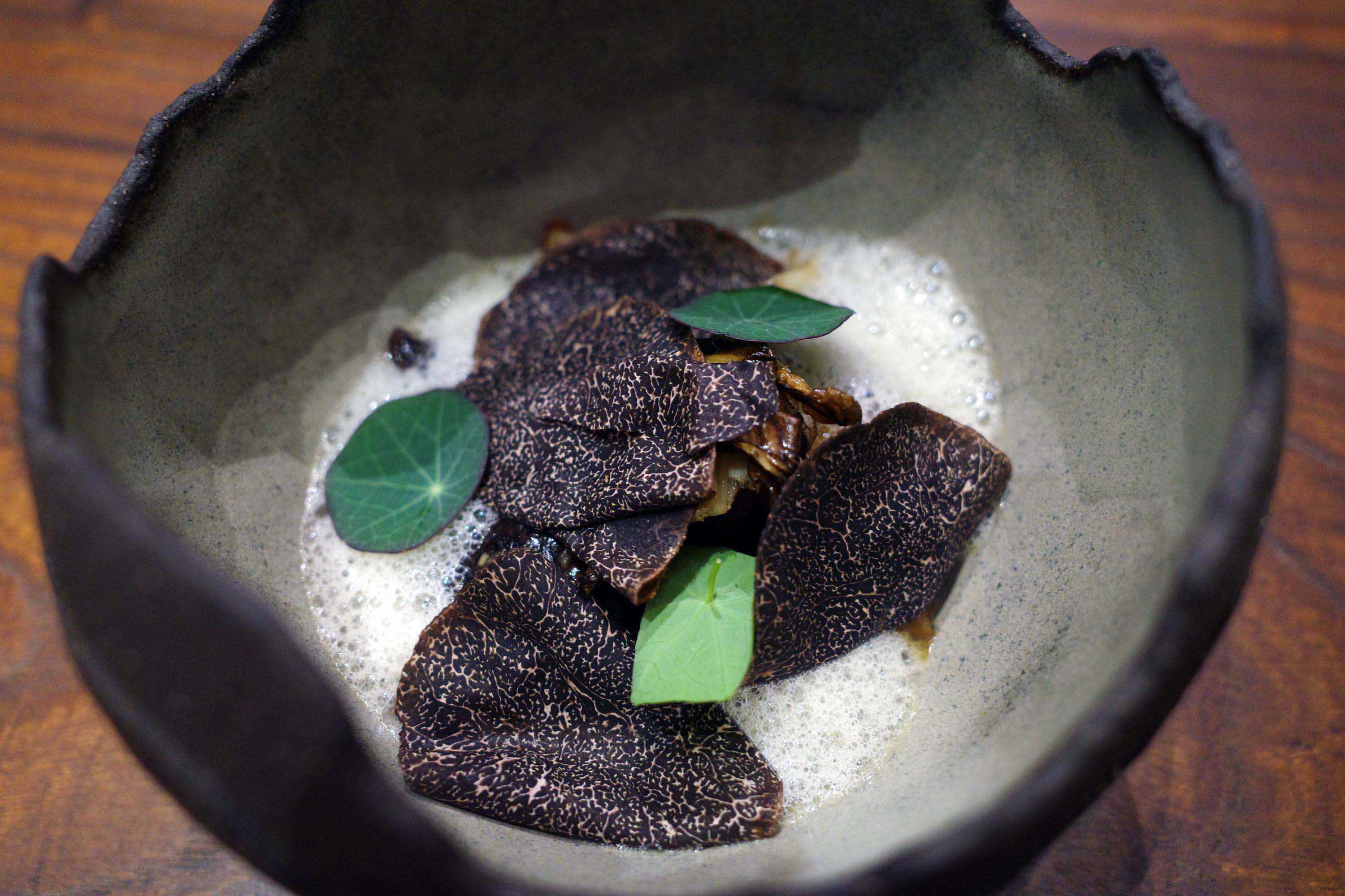 旬の恵みをふんだんに閉じ込めたのが、“季節のキノコ / 落花生 / 仔豚”。以前ゲストに提供したところ、好評だったので再登場となった人気の一皿。日によって仕入れが異なる茸を用いた一品で、この日はムキタケ、ヒラタケ、マイタケなど6種類の茸。千葉県の落花生“おおまさり”もよい甘味。上には黒トリュフとナスタチウムがあり、下には濃厚な卵黄と、香り高いヴァン・ジョーヌのソース。カリカリに仕上げた仔豚の脂が、塩味と旨味で味わいに骨格を与えている。