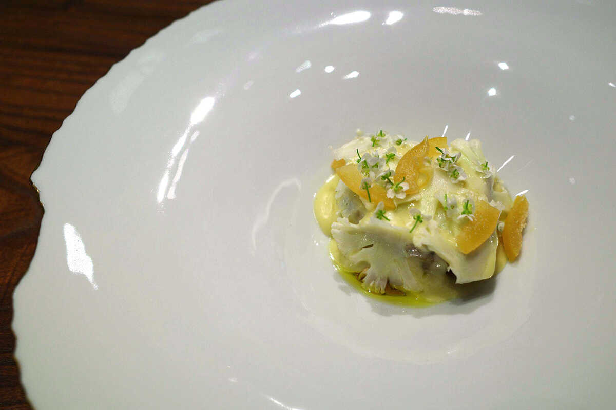 “カリフラワー / バイ貝 / アンコウ”は、アンコウとカリフラワーの取り合わせ。丁寧に火入れしたアンコウは、身が締まり、旨味が凝縮されていて乙な味わい。スライスしたフレッシュなカリフラワーとカリフラワークリームのほのかな甘味がいい。レモンピールがのせられ、アリッサムの花が可憐。