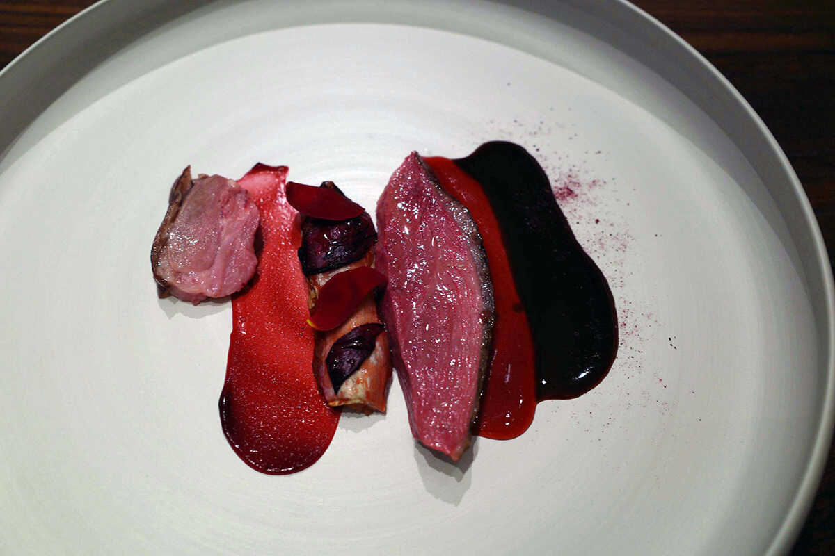 メインディッシュは、宮本氏が惚れこんだ“恵鴨(めぐみがも)”を主役にした“マルメロ / 薔薇 / 恵鴨”。愛知県で生産されているブランドの合鴨肉で、最小限のストレスで育てられているから、繊細で上品な食味になっている。恵鴨を薪焼きで丸ごと焼いてテーブルまで見せにきてくれる演出がいい。胸肉と腿肉をしっとりと仕上げ、食べ比べを楽しめる。西洋カリンとも呼ばれる“マルメロ”のあっさりとした甘味も鴨との相性抜群。