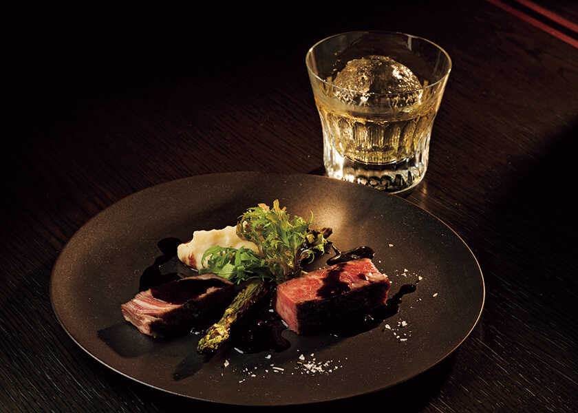 〈ジャヌ グリル〉の特別コースメニューとペアリング。写真は“響30年”のロックと、“熟成黒毛和牛Tボーングリル いぶりがっこのマッシュポテト ポワブラードソース”